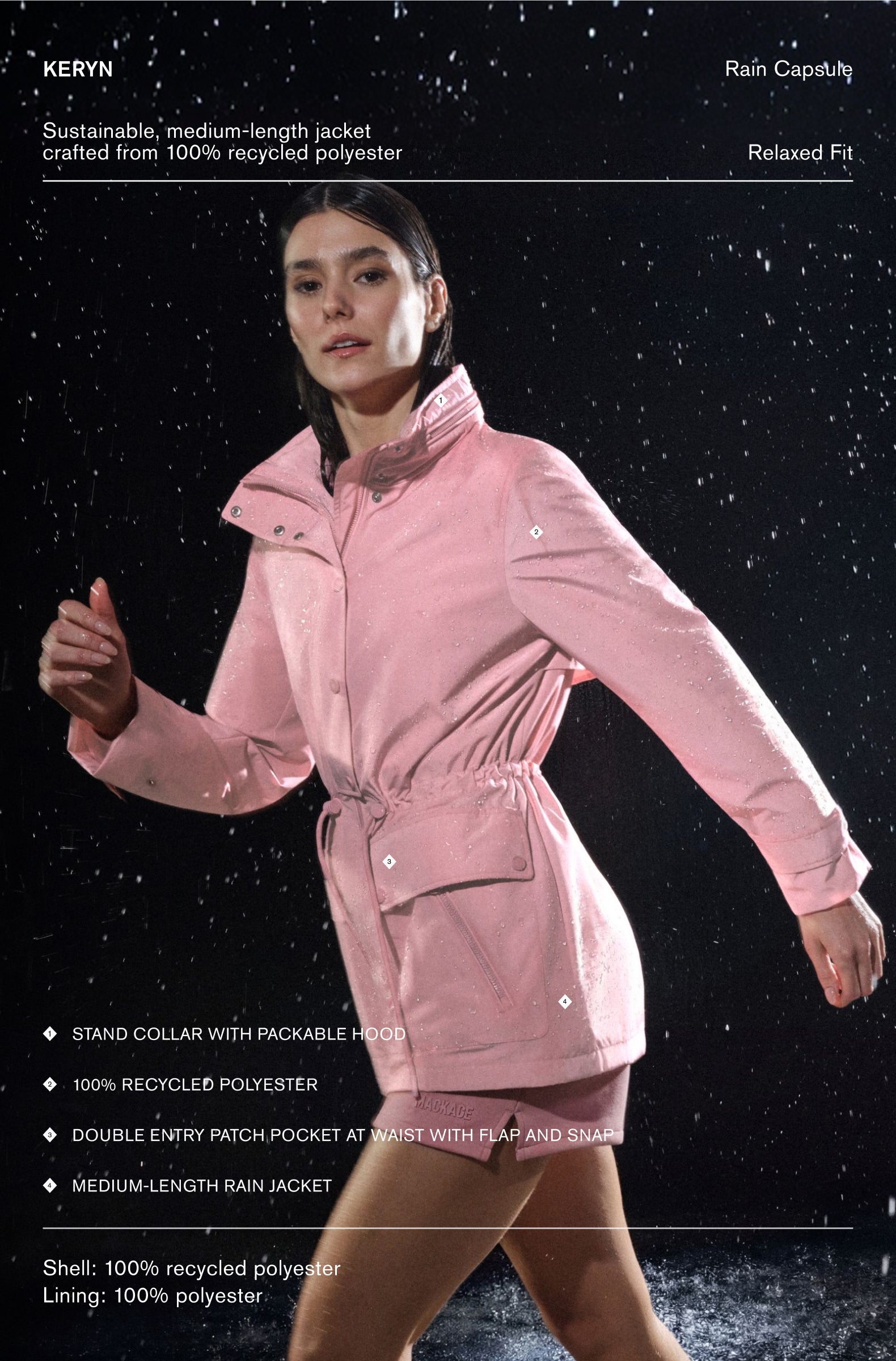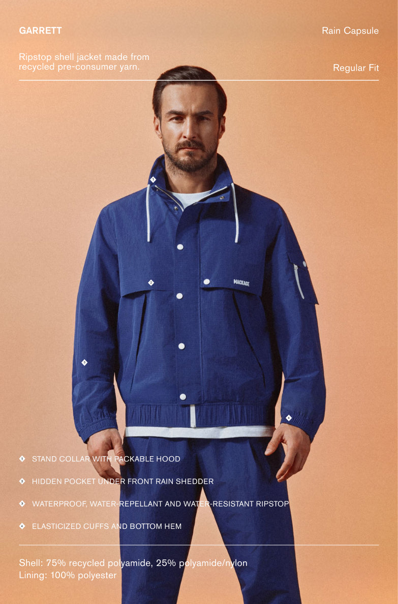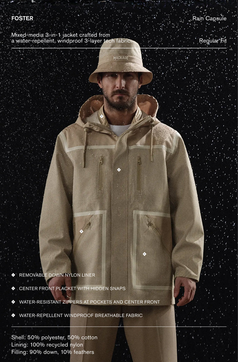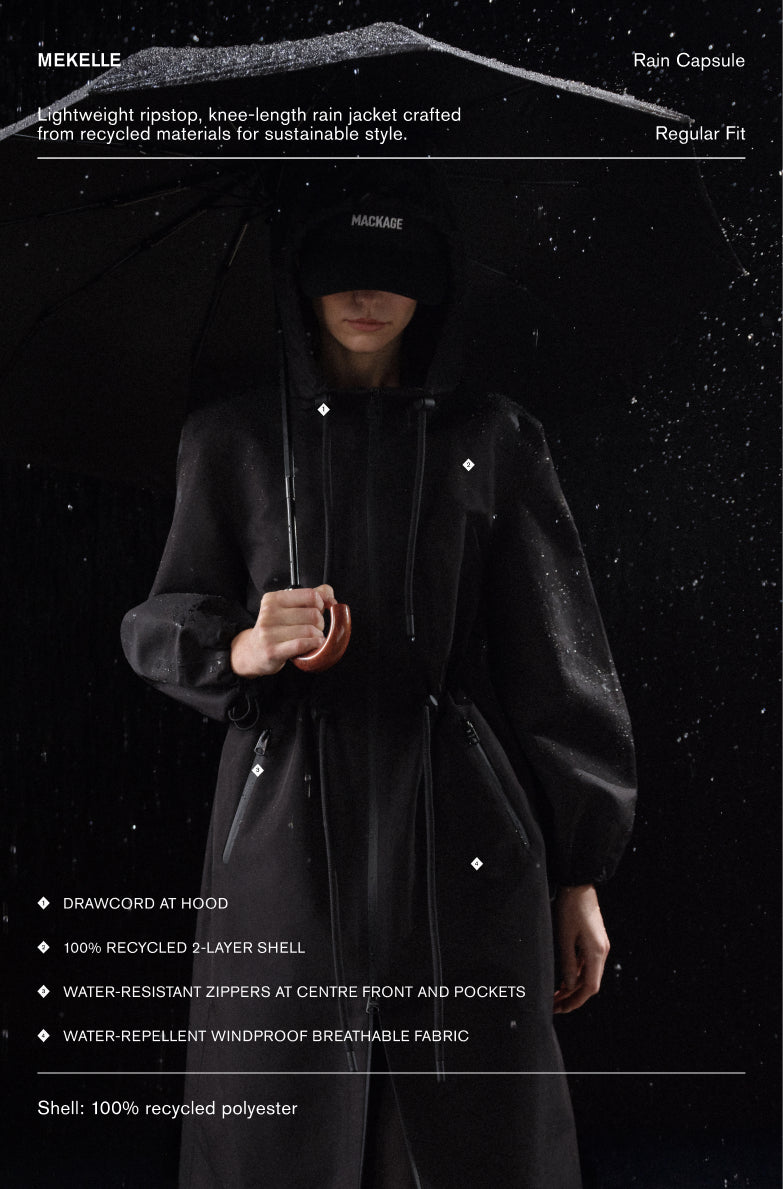 MACKAGE RAIN responds to constant variability, from light mist to sustained downpour, with garments designed to adapt in real time. Engineered for these conditions, the collection balances weather protection, breathability, and mobility to maintain comfort and performance throughout changing forecasts.