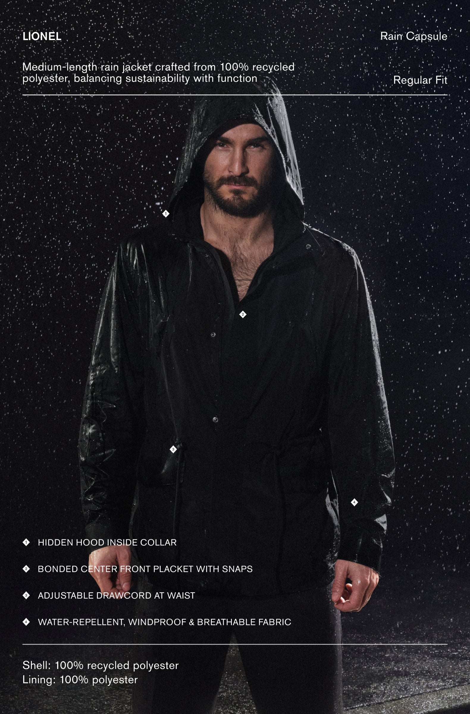 Designed for movement in all conditions, each piece reflects a disciplined approach to protection and form. In rain or in transition, the collection asserts a refined resilience, uncompromising in performance and exacting in silhouette.