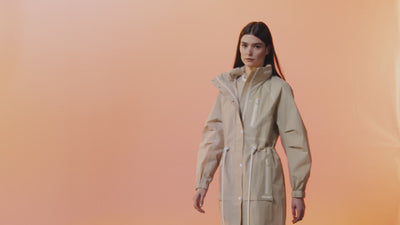 The collection continues with ultralight rain shells in GRS-certified recycled polyester. Maxi and field-style silhouettes are engineered for all-weather performance—packable hoods with storm visors, bonded detailing at plackets and cuffs, and storm-ready construction throughout. Water-repellent, windproof, and breathable, each piece is distilled to a minimal, functional form.