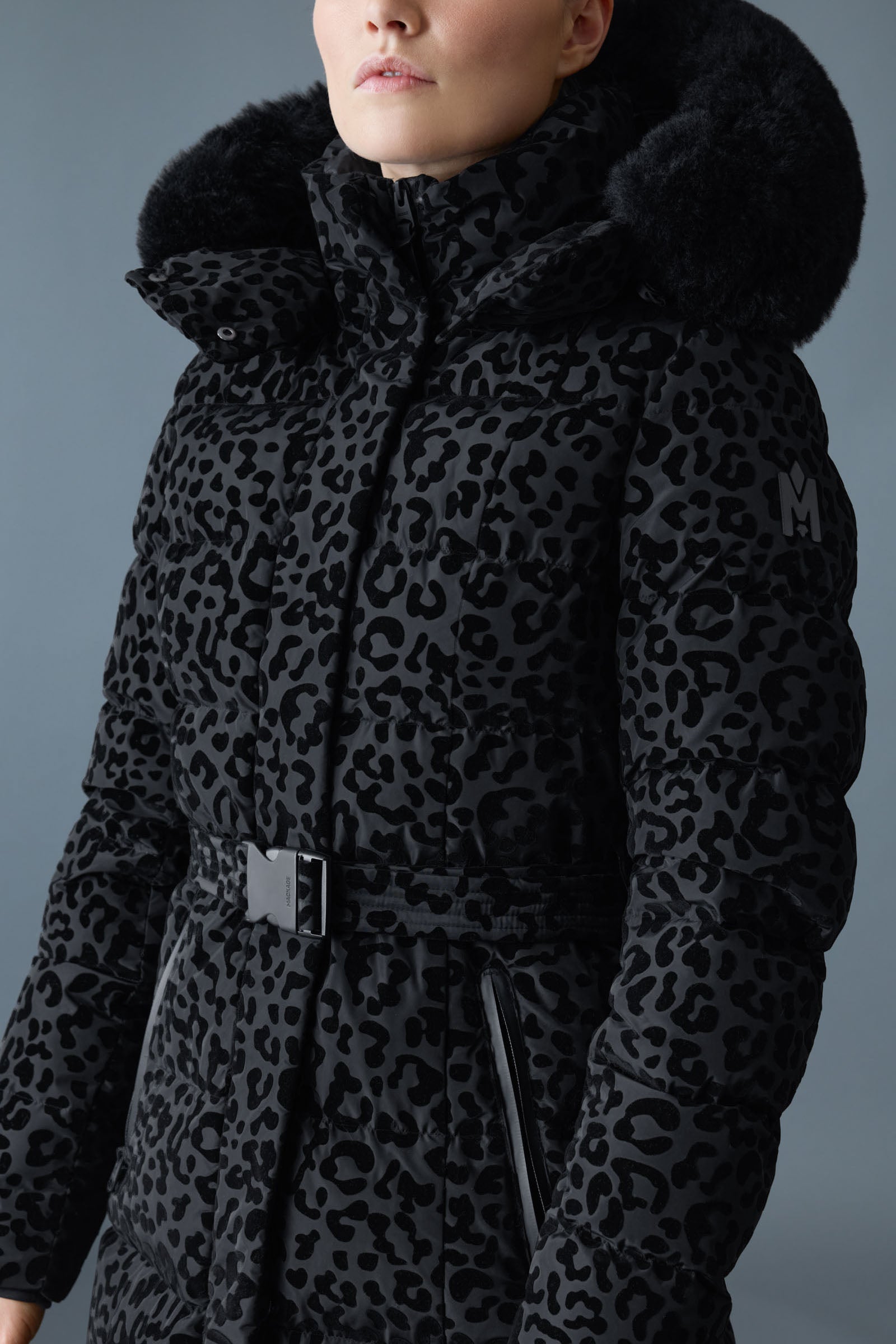 CALINA-FLPZ is a fitted down-filled maxi coat featuring a novelty flocked shell. Designed for deep cold protection, it includes a water-resistant front zip with hidden snap placket, insulated pockets, and an adjustable hood with bungee drawcord. The elongated, fitted silhouette is defined by a belt with buckle while a removable shearling-trimmed hood offers complete coverage.